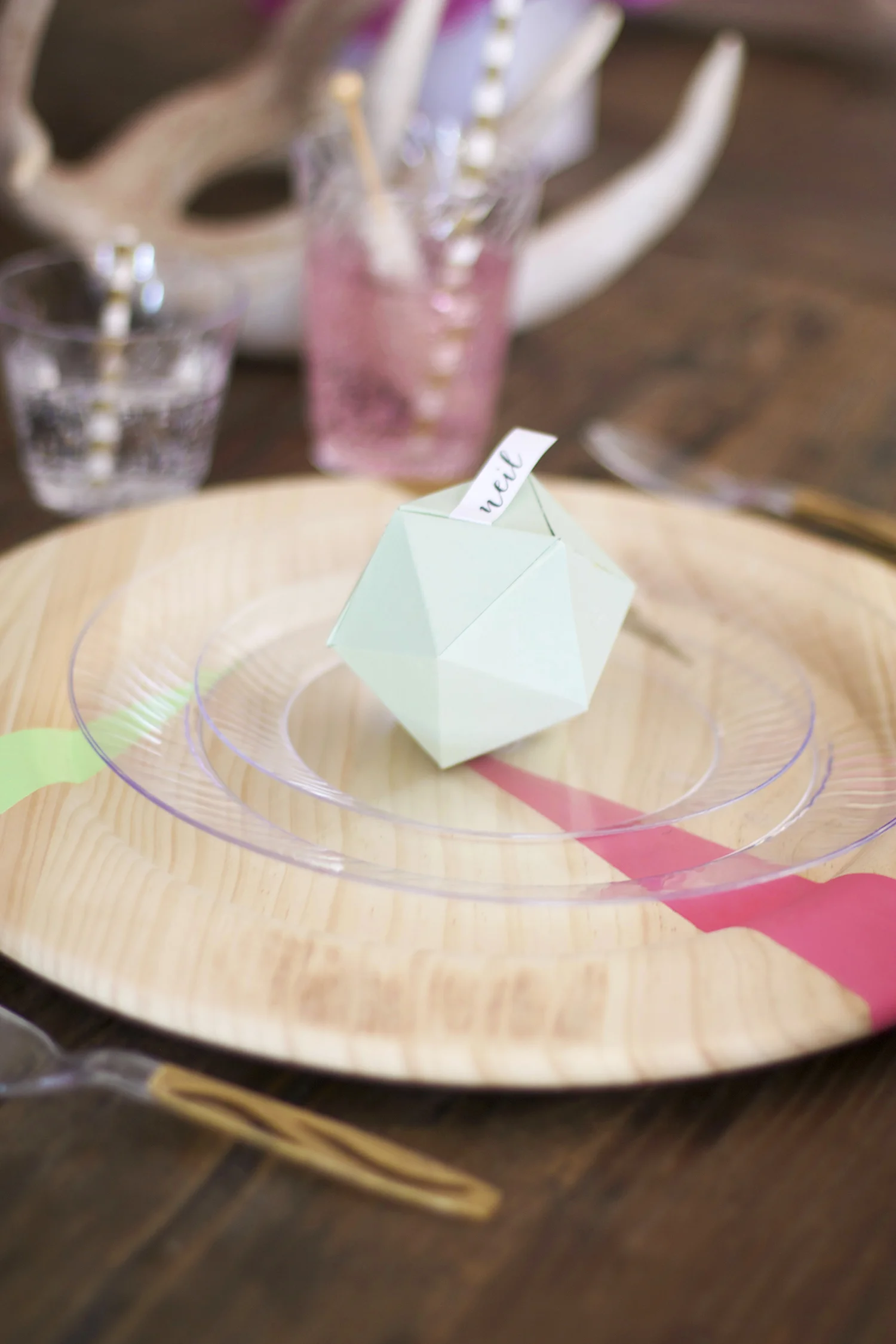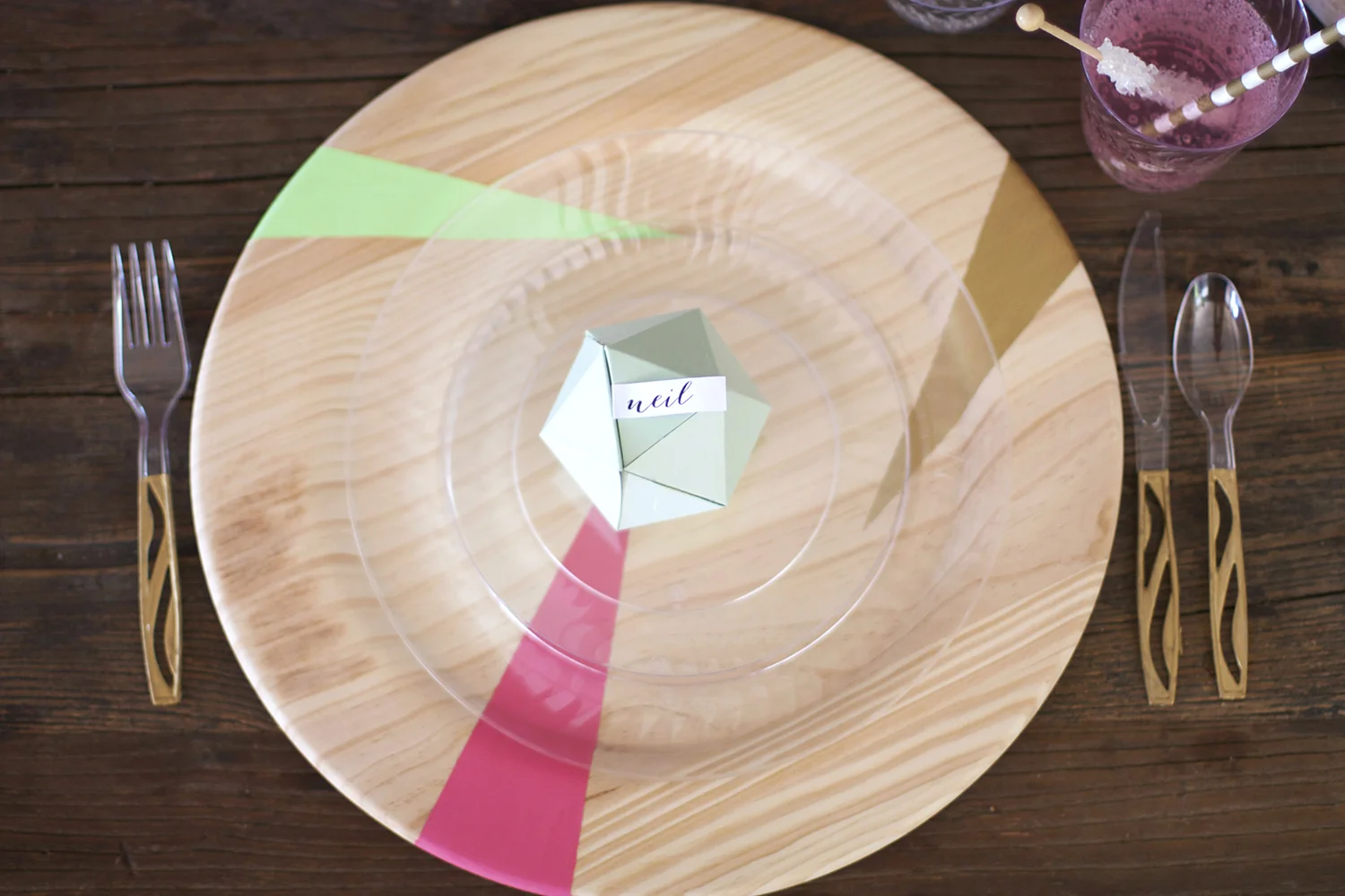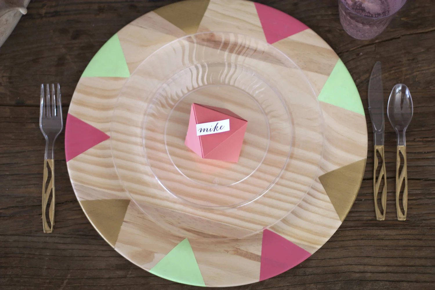 The Geometric Party I threw for Chinet was one of my favorites so far. Today I'm reliving that party with you and showing you how to make the geometric chargers I used to snaz up the plastic flatware for the party. If you haven't been able to tell, I've been a wee bit obsessed with the geometric trend as of late. I've put it on my walls, in my wardrobe, and on my shelves. For the full tutorial on how to make these geometric chargers, hop on over to Brit + Co.