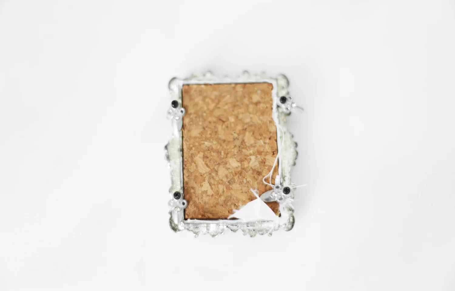 I took the glass out of the frame. I then cut out a piece of very thin cork board. I covered the cork board with a small piece of white silk fabric. Third, I put the covered cork board piece back in the frame and secured the back.