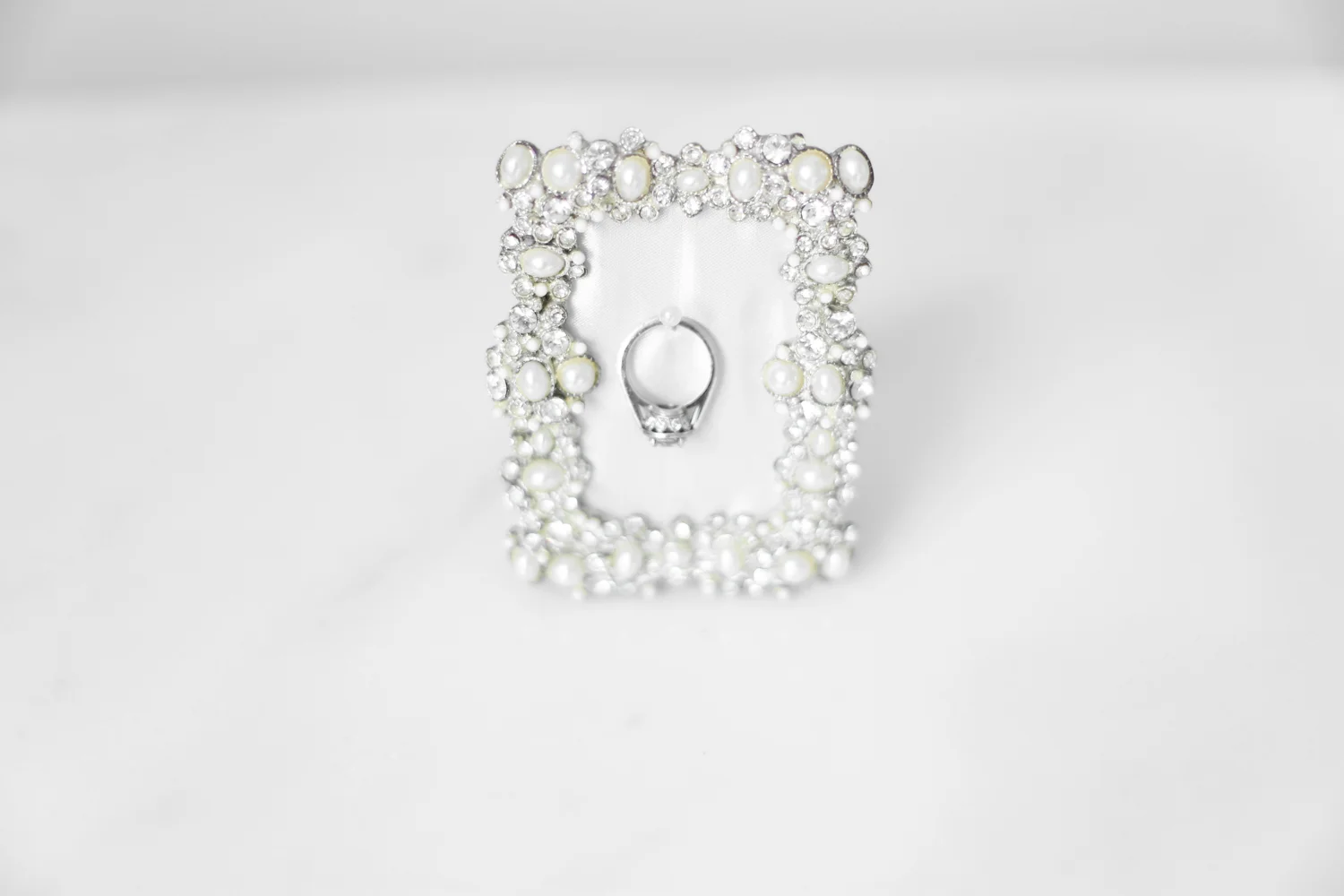 So, I had an idea ... why not display my ring in a beautiful way? Maybe a DIY engagement ring display? Immediately, I thought of a mini frame I had bought a long time ago and never used that was sparkly and pearly ... the perfect thing to display a soon-to-be wed emblem. You obviously can't put a ring into a frame, so I had to do some transforming. Here's what I did in case you want to try ... P.S. Here are my engagement photos in case you are interested.