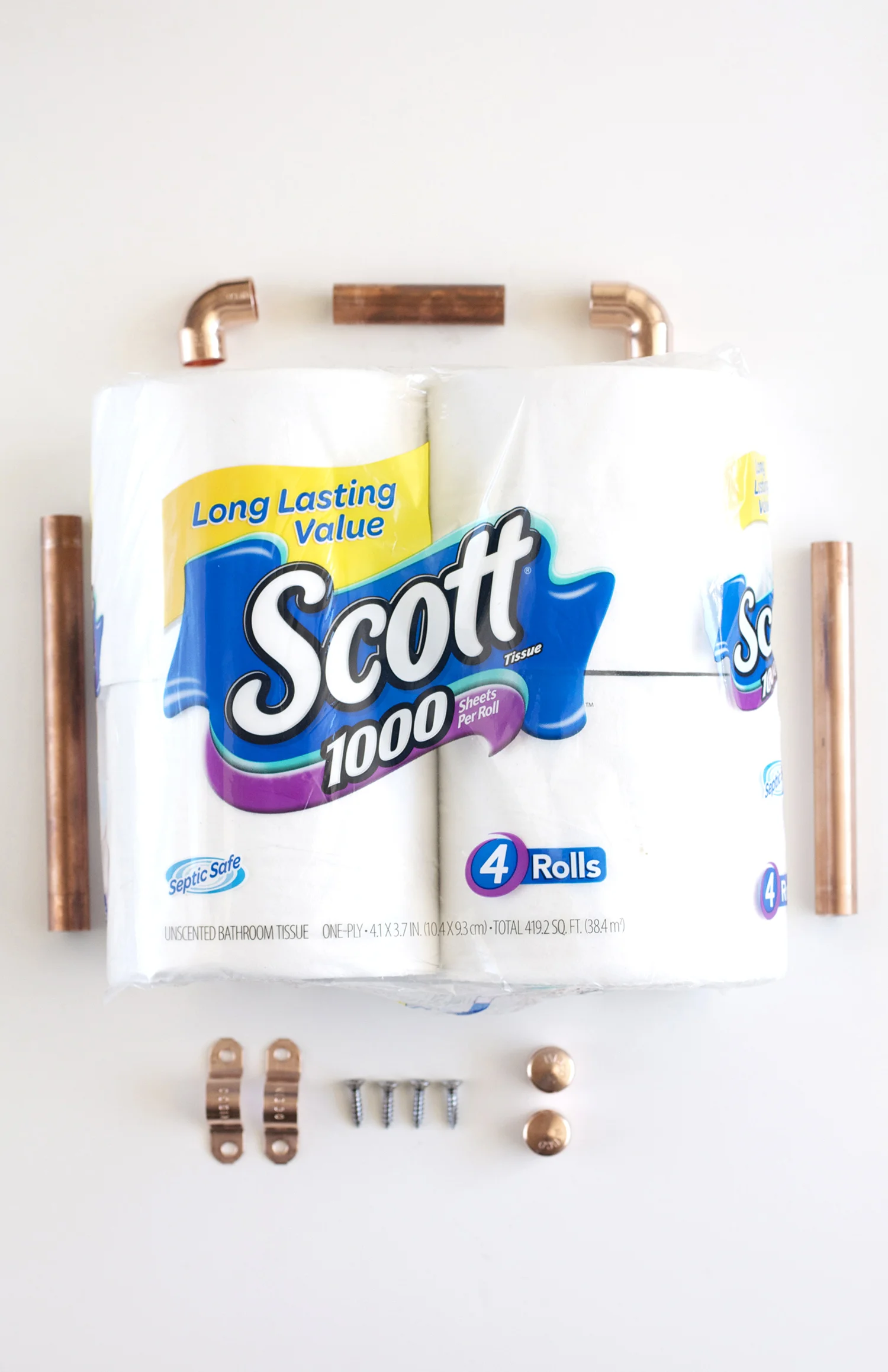 Measure how big you need the third piece of copper based on the size of your toilet paper roll. You want to make sure you have extra space in between the roll and the top copper pipe, so you can roll out your toilet paper. For reference, I cut my piece to 3 1/4." Attach the 90 degree copper fittings to the pipes to make a "U" shape like the photo.