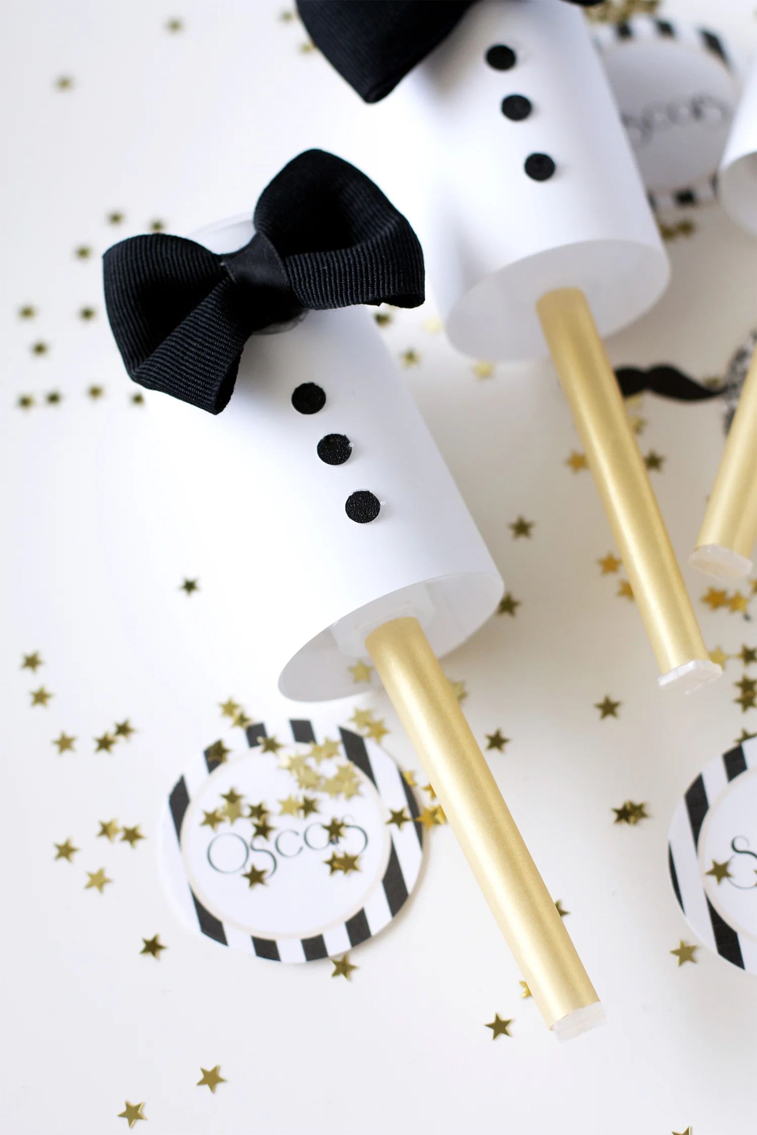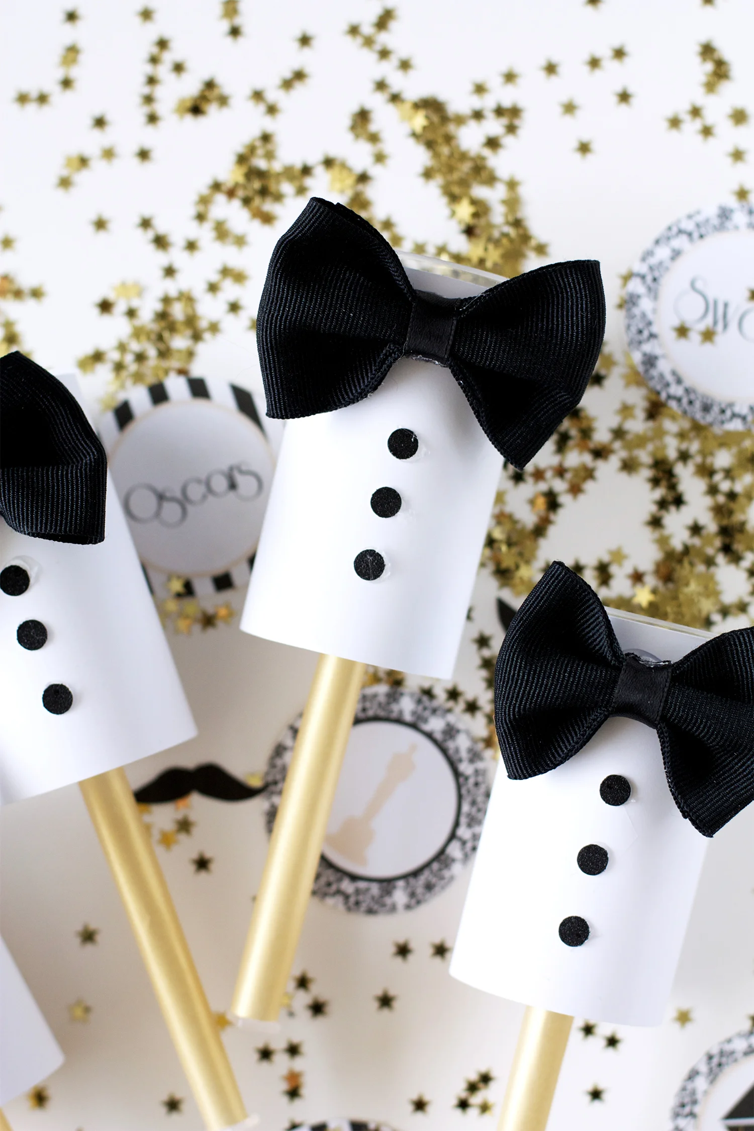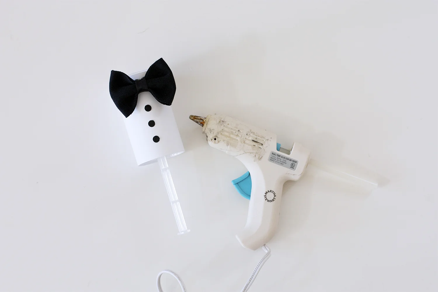 Wrap the white paper around the treat pops and glue in place. Glue the bow tie onto the white paper. Glue the black circles onto the white paper.