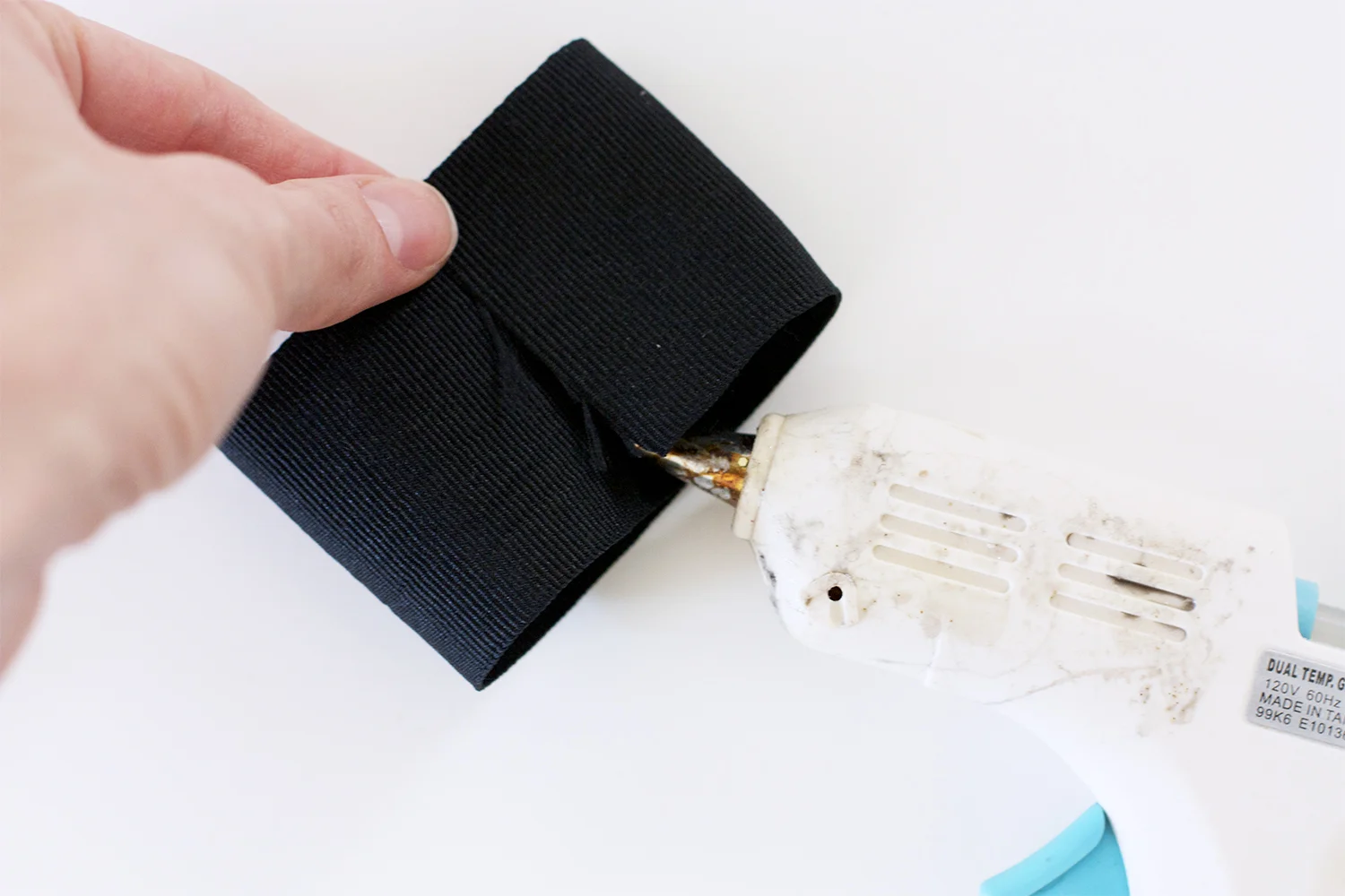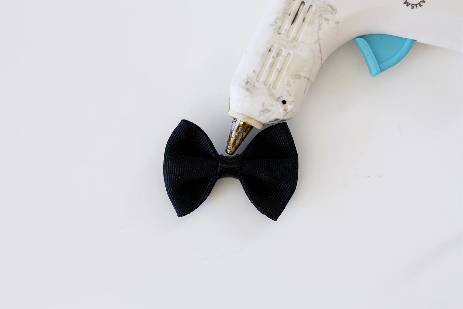 Cut a piece of the thin black ribbon to about 1.5." Wrap the thin ribbon around the center of the wide ribbon to make a bow tie. Trim and glue the ends together.