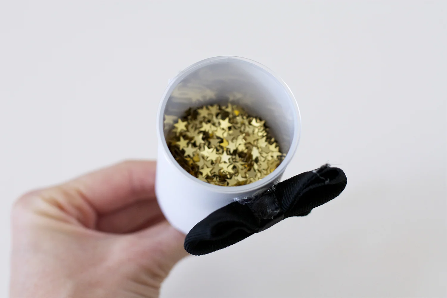 Fill the top with confetti. Put the cap on. When you are ready to party, take the top off, and push up the stick with some force to let the confetti fly!