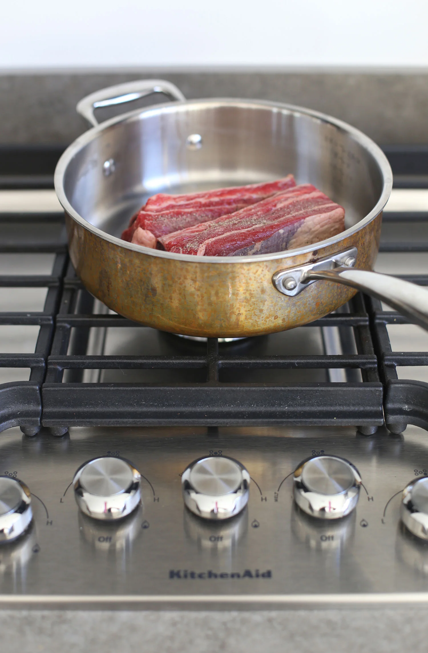 To make these slow cooker tacos, you start by browning short ribs. You don't have to do this step, but I find that getting a good sear on the meat lends rich flavor to the final dish. You don't cook these for long on the cooktop. Sear each side until just browned on medium heat. It will only take you a couple minutes on each side.