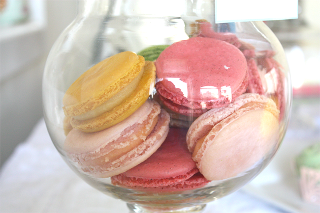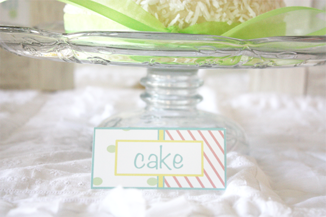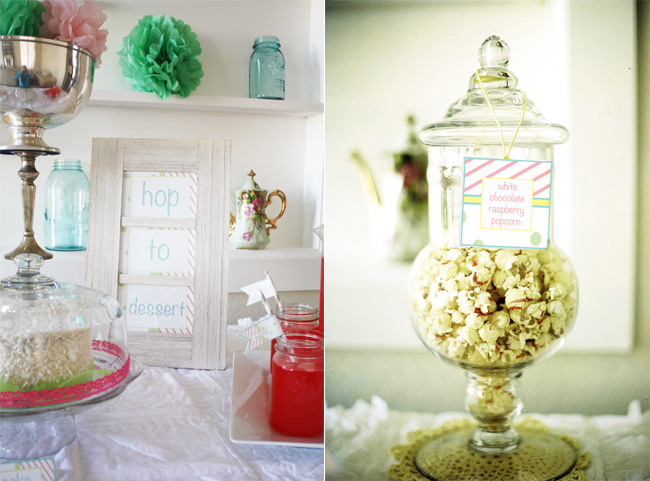 Utilizing our Vintage Easter Party Printable Collection, I paired the pastel colored printables with artsy and colorful desserts. I chose macarons using a healthier organic recipe, white chocolate raspberry popcorn (a popcorn bar is a healthier alternative), a healthier fresh coconut cake, and an assortment of skinny cupcakes with pastel frosting. The popcorn and macarons were put into apothecary jars, while a white serving tray was used for the cupcakes. In my opinion, some drinks can double as dessert so I included a serving tray of organic strawberry lemonade to wash down all the goodies.