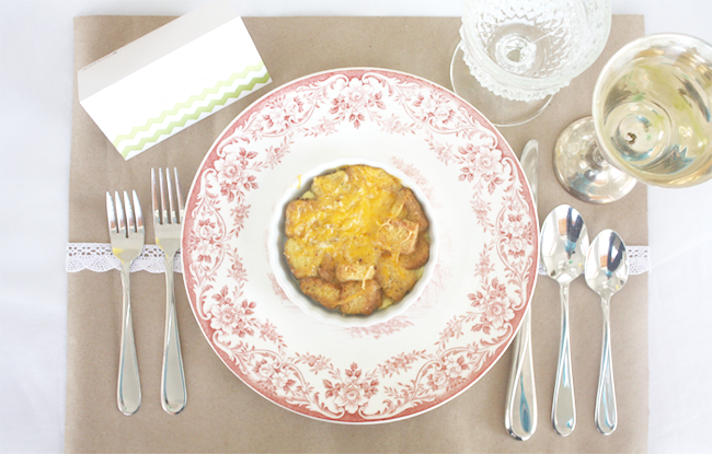 Using my Vintage Easter Party Printable Collection to showcase the food items, our brunch menu consisted of coffee cake, muffins, fruit, and individual continental casseroles. Here is our family recipe for Continental Casserole, which you can serve individually or family style!